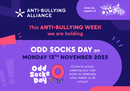 To raise awareness of anti bullying week, we will be inviting the children to come to school wearing odd socks to signify our uniqueness. The children will listen to an assembly and the focus of their work in PSHE lessons will be anti bullying.